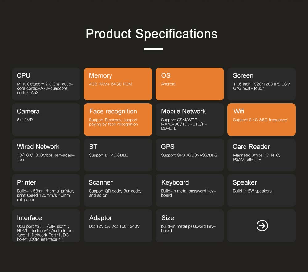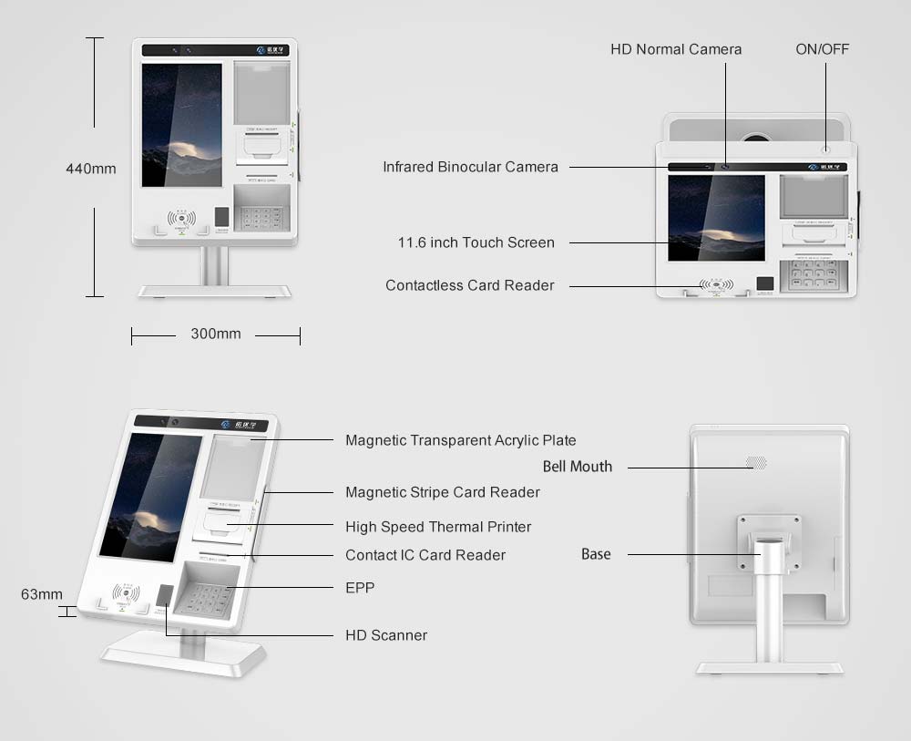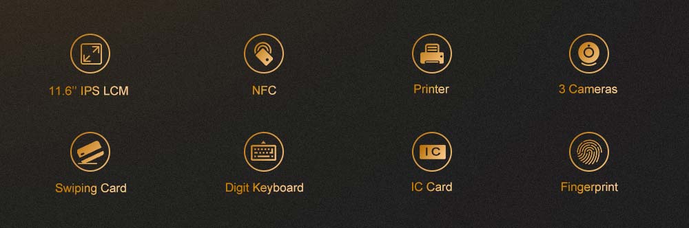 | Financial module | Fingerprint module collection, Magnetic card, Contact IC card,NFC card, Password Keyboard, 1D/2D barcode scanner, 58mm printer |
