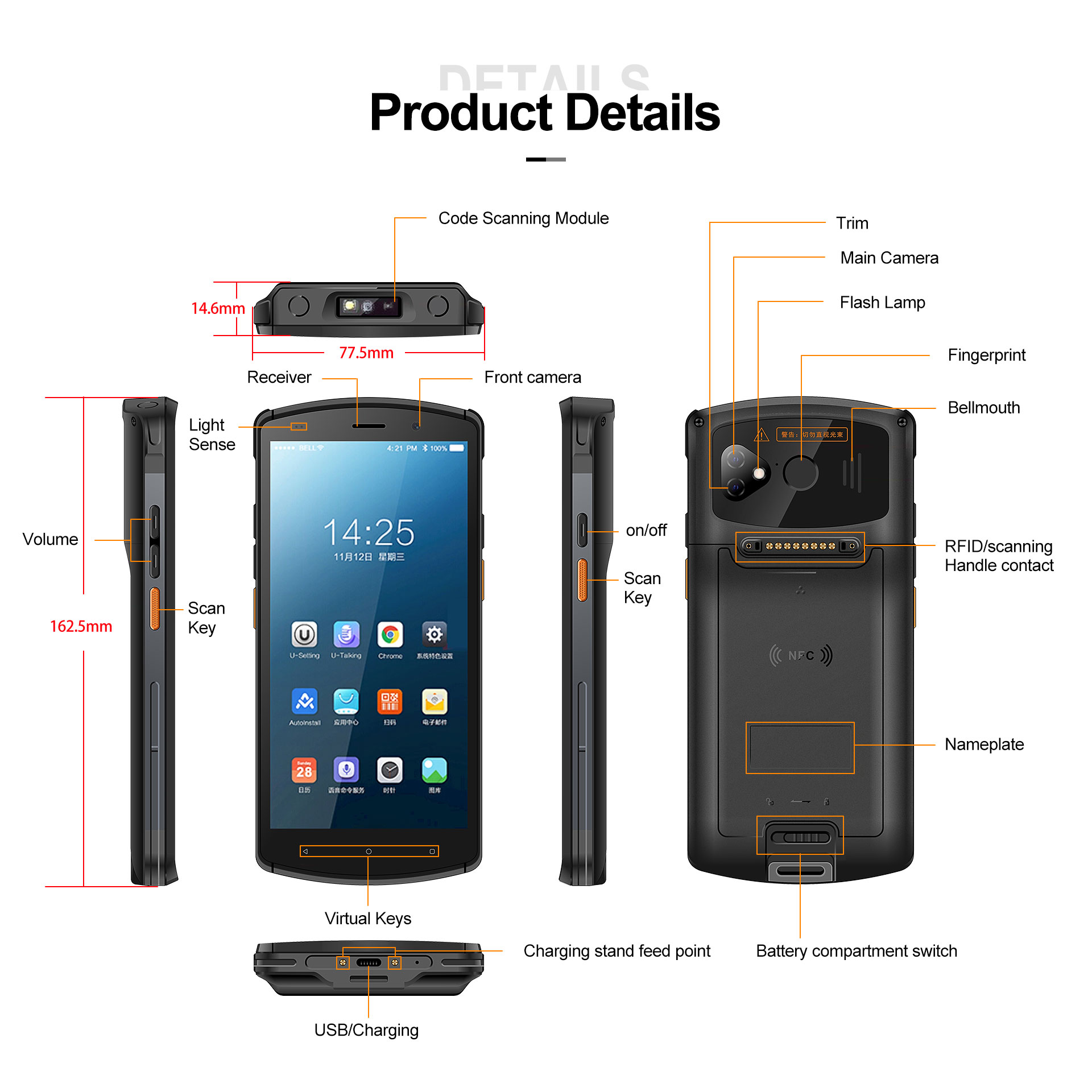 | Functions | Camera,NFC,Infrared scanner,Fingerprint,5G Sim,Wifi,BT |